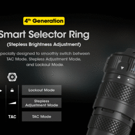 Nitecore SRT7i is equipped with the 4th generation Smart Selector Ring, available with rotation & press for one-handed control of modes switching and stepless brightness adjustment, ideal for instant response in tactical applications.