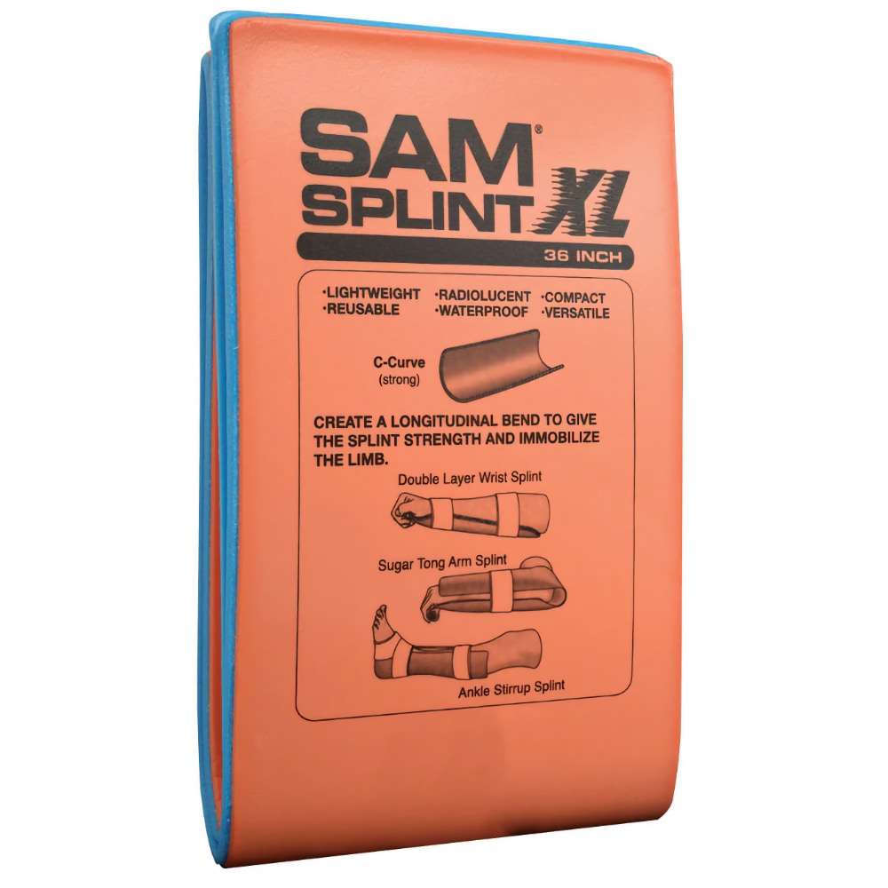 The SAM (Structural Aluminium Malleable) Splint Regular is a compact, lightweight, highly versatile device designed for immobilizing bone and soft tissue injuries in emergency settings. It consists of a layer of .016 inches (0.41 mm) strips of soft aluminum, with a polyethylene closed-cell foam coating.