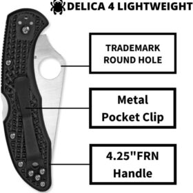 This Spyderco Delica 4 knife has a flat saber-ground VG-10 stainless steel blade that is satin finished with a SpyderEdge serrated cutting edge. The handle is black FRN (fiberglass reinforced nylon).